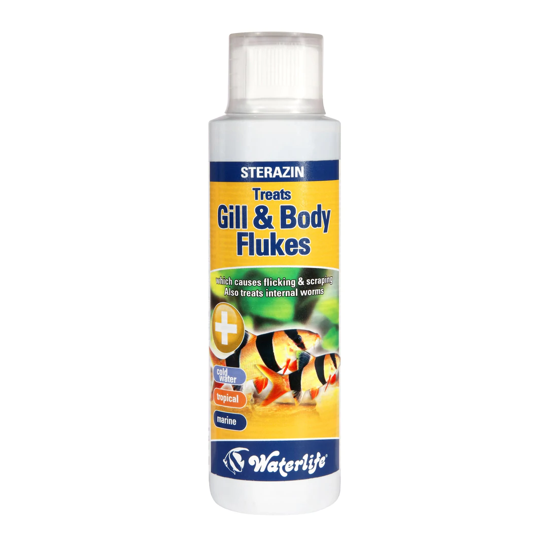 Waterlife Sterazin is a treatment for the control of gill and body parasites which cause fish to flick when no symptoms are visible to the unaided eye.